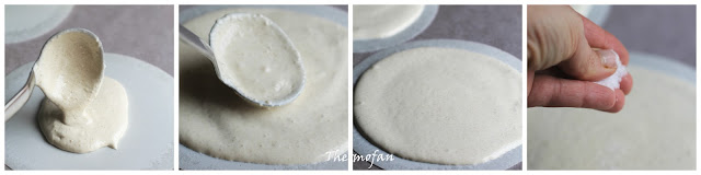 - Verter dos cucharones de la mezcla encima de las obleas (a las que con mucho cuidado, para que se rompan, hacemos un agujero en medio) o del papel. Es necesario hacerlo con cuidado para evitar que la oblea se rompa.