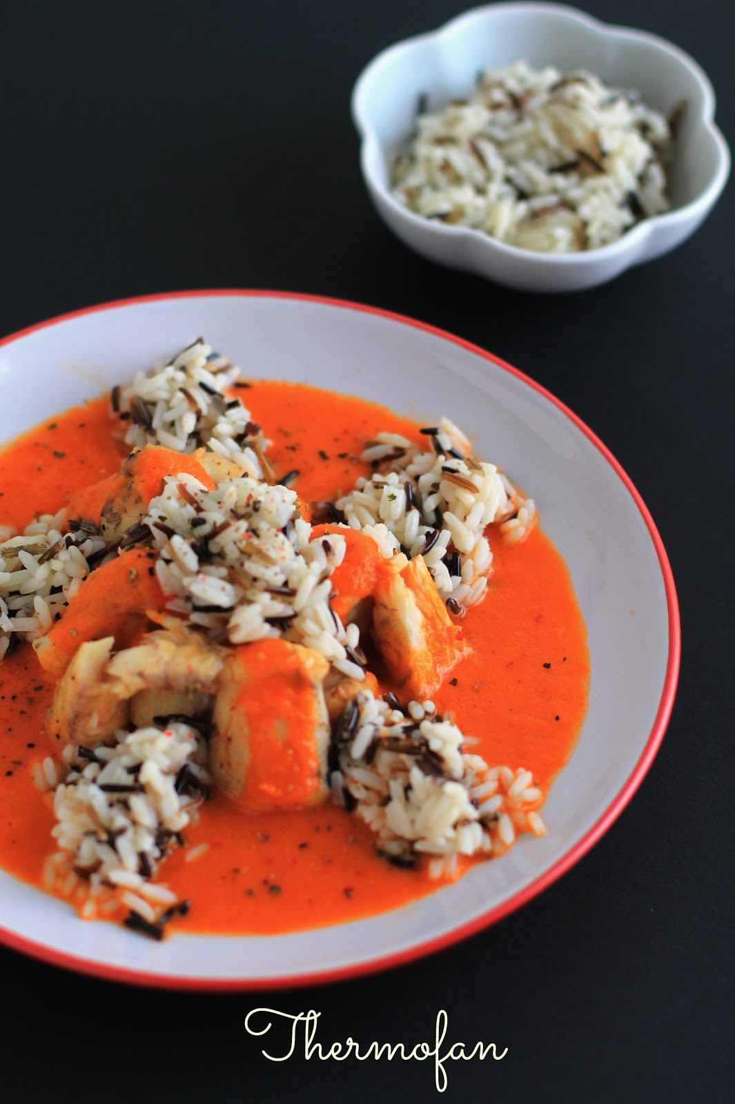 Migas de rape en salsa roja y arroz salvaje, olla rápida