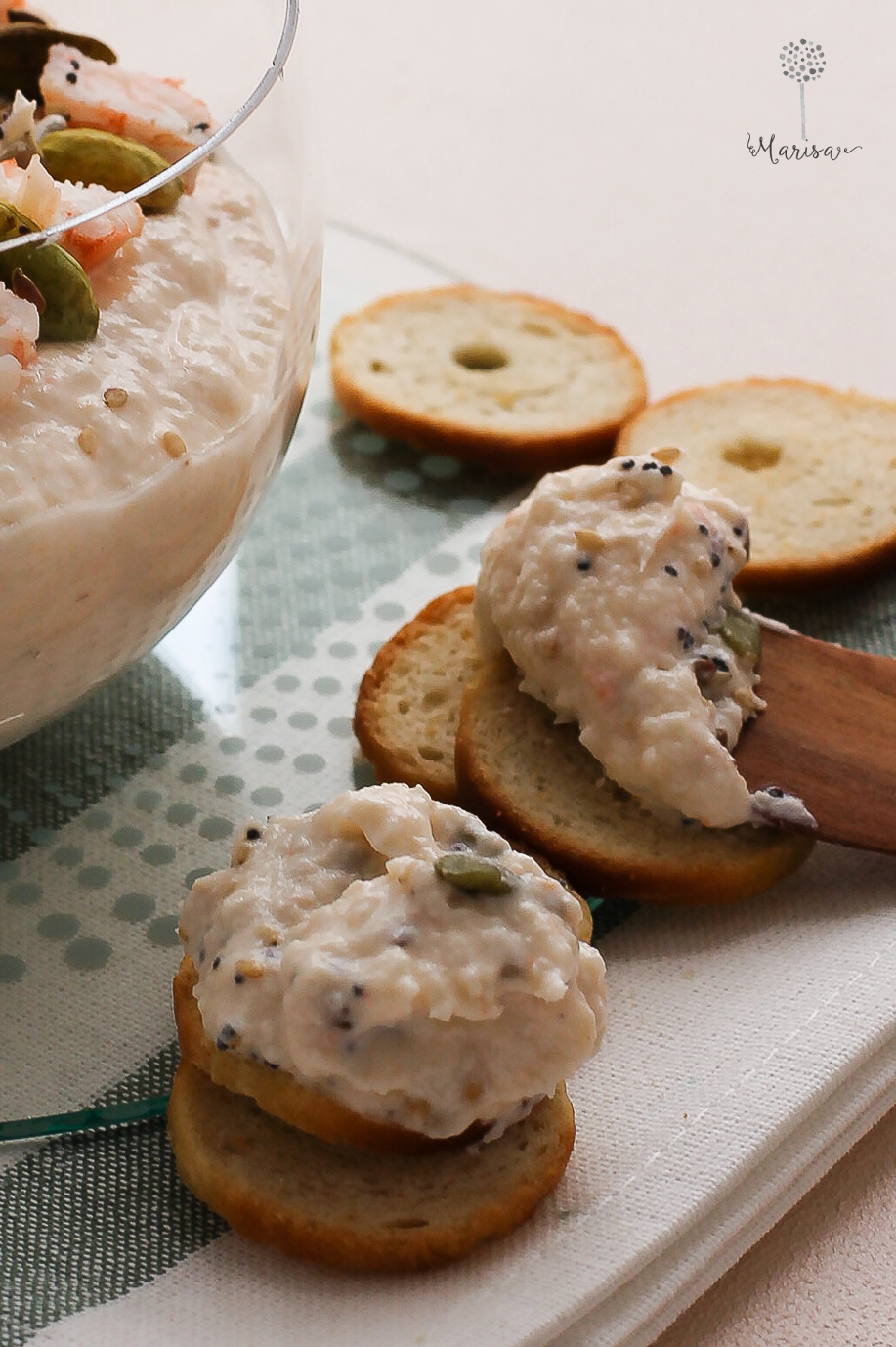 Pasó otro mes y estamos de nuevo a 1. El primer día del mes de Noviembre y volvemos con Reciclando Sabores. Hoy os traigo una crema en la que he reciclado bastantes ingredientes. Una crema de queso casero de yogur para poder tomar untándola en tostadas, galletas saladas o las comerciales, elaboradas especialmente para ello. A partir de unos langostinos cocidos congelados en agosto, pensé en esta receta. No quería sacarlos como aperitivo porque ya no nos apetecían. También tenía Queso fresco de yogur, dos texturas, que había hecho el día anterior y un trozo pequeño de queso valenciano curado que había congelado. Al abrir un cajón, descubrí un paquete de pistachos que necesitaban con urgencia ser consumidos y entre unos y otros, di forma a esta crema, que si os digo, que en casa, gustó, ya imagino, que os apetecerá prepararla.